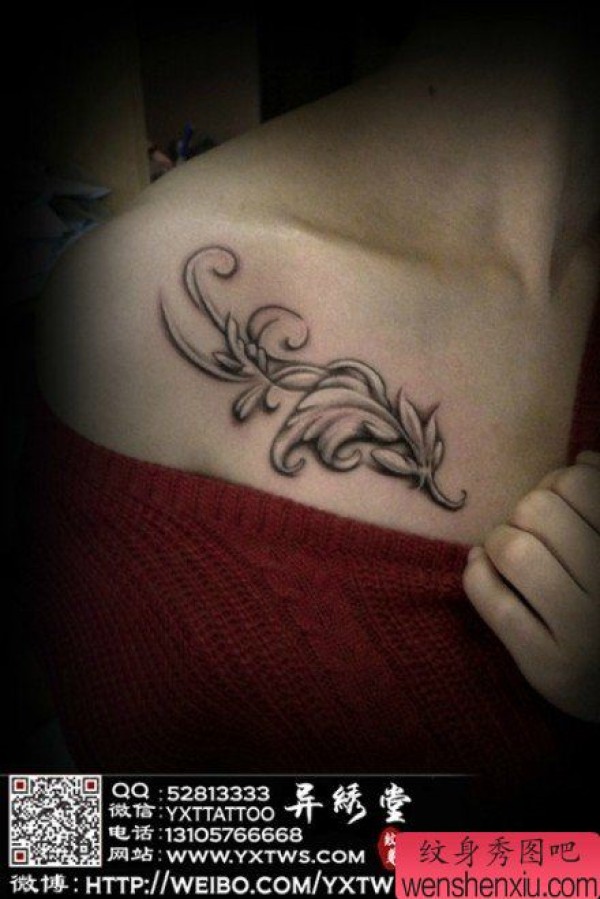 美女胸前唯美时尚的树叶纹身图案