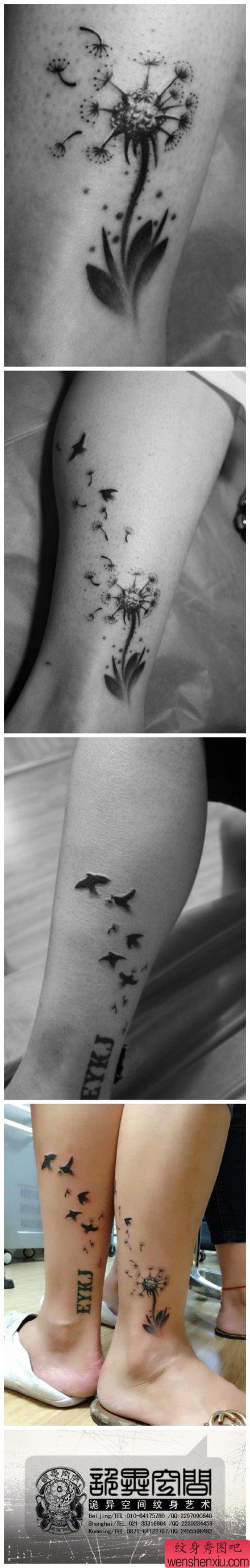 腿部精美时尚的情侣蒲公英与小鸟纹身图案