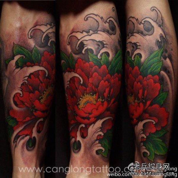 腿部时尚好看的传统牡丹纹身图案