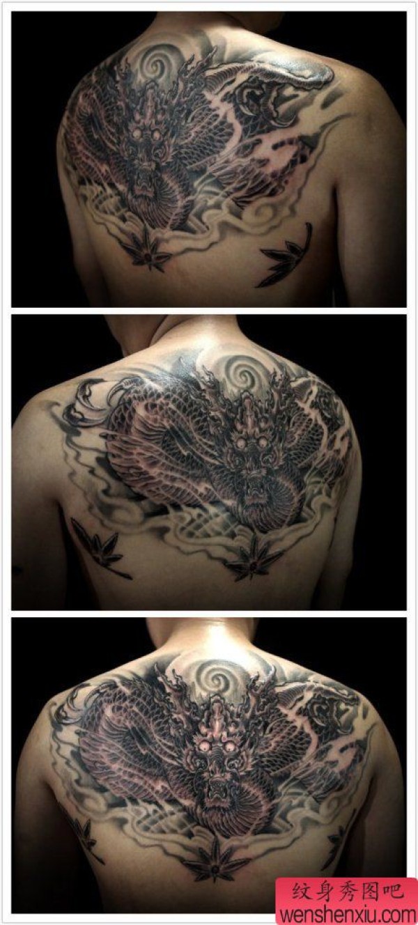 男生后背时尚很酷的黑白龙纹身图案
