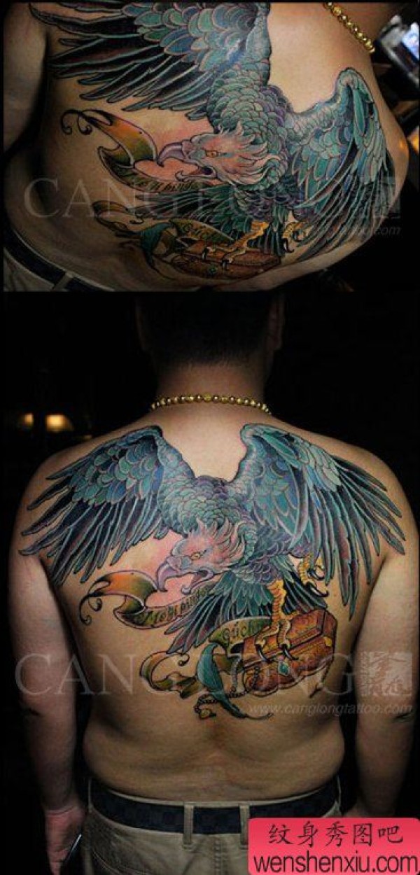 男士后背时尚很酷的一张彩色老鹰纹身图案
