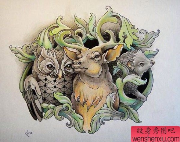 一套时尚时尚的小鹿猫头鹰刺猬纹身手稿