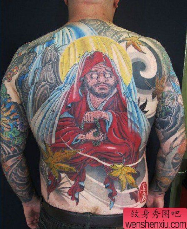 男士后背经典的满背达摩祖师纹身图案