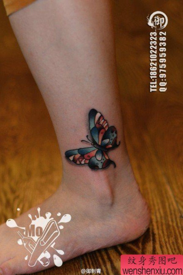 女生脚踝处小巧精美的彩色蝴蝶纹身图案