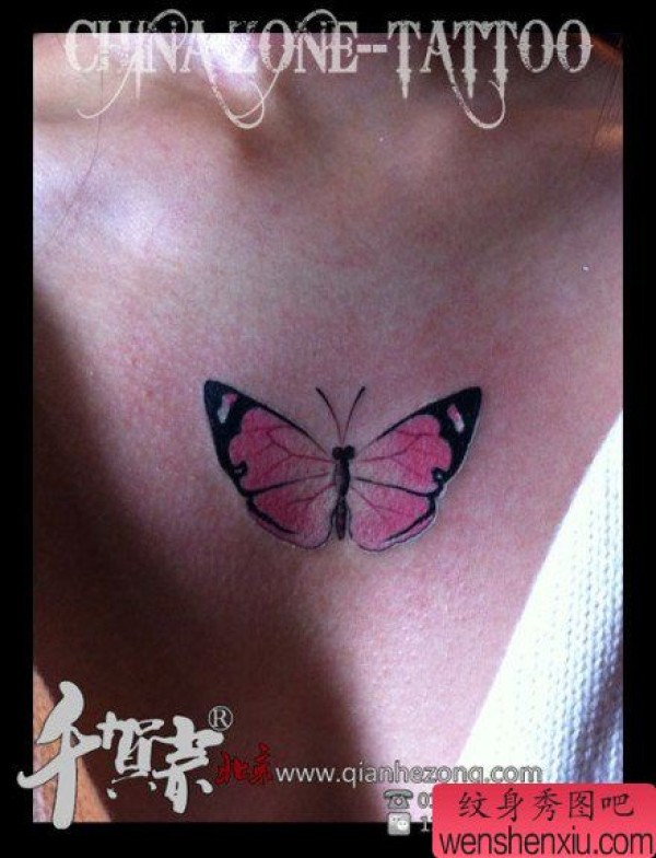 女生胸前小巧精美的粉色蝴蝶纹身图案