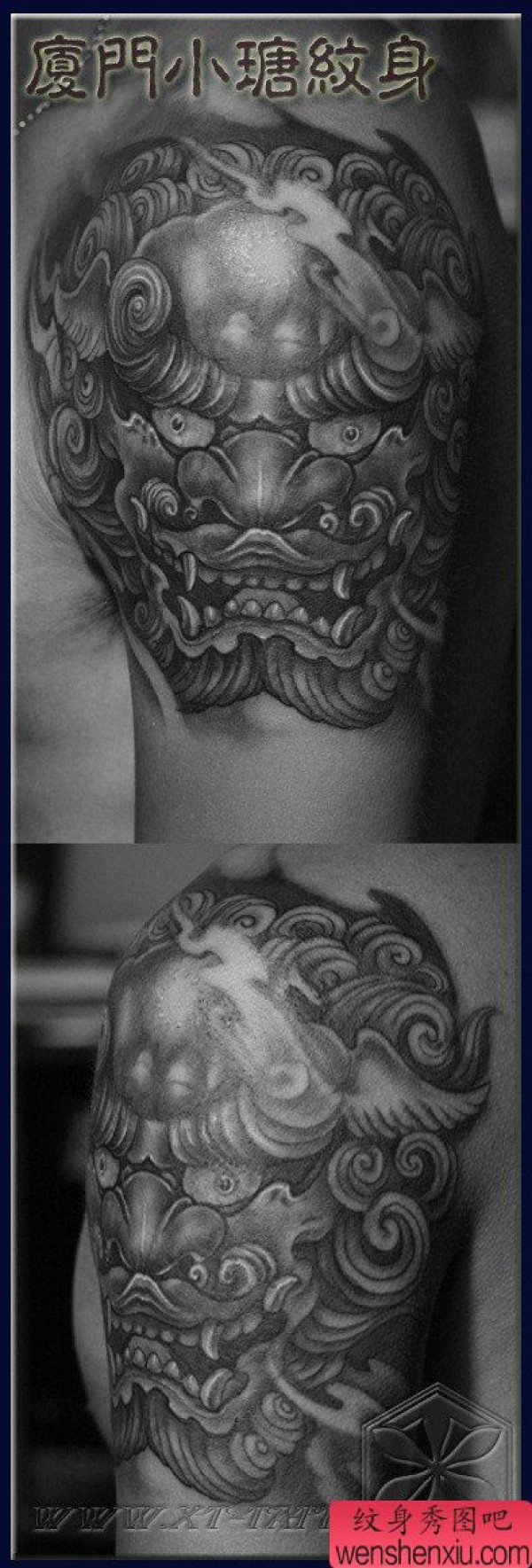 手臂时尚时尚的一张黑白唐狮子纹身图案