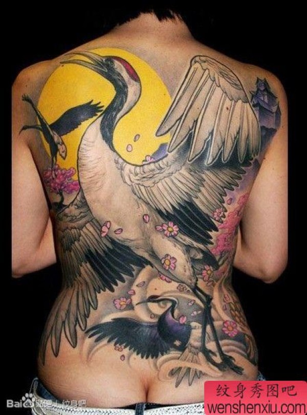 时尚经典的满背白鹤仙鹤纹身图案