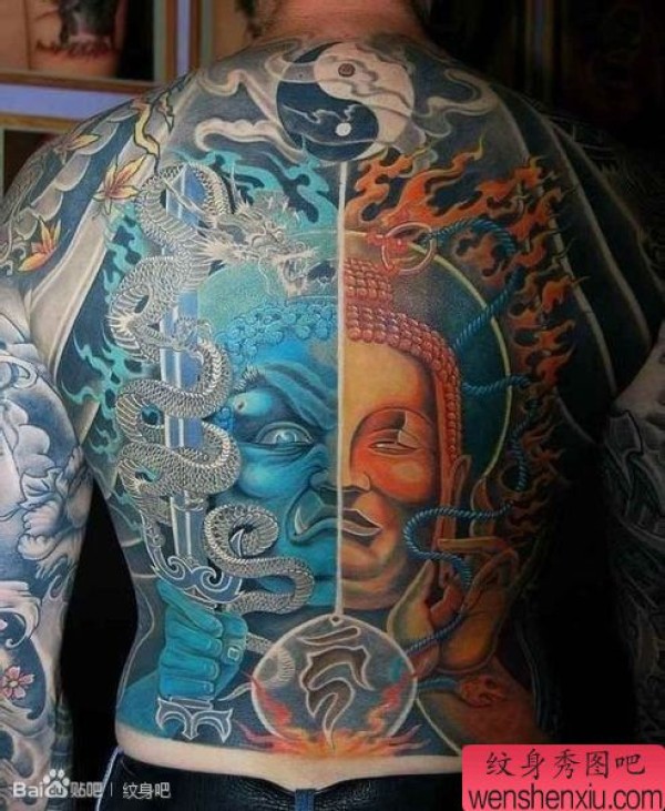 男士后背很酷的满背一半不动明王一半佛头纹身图案