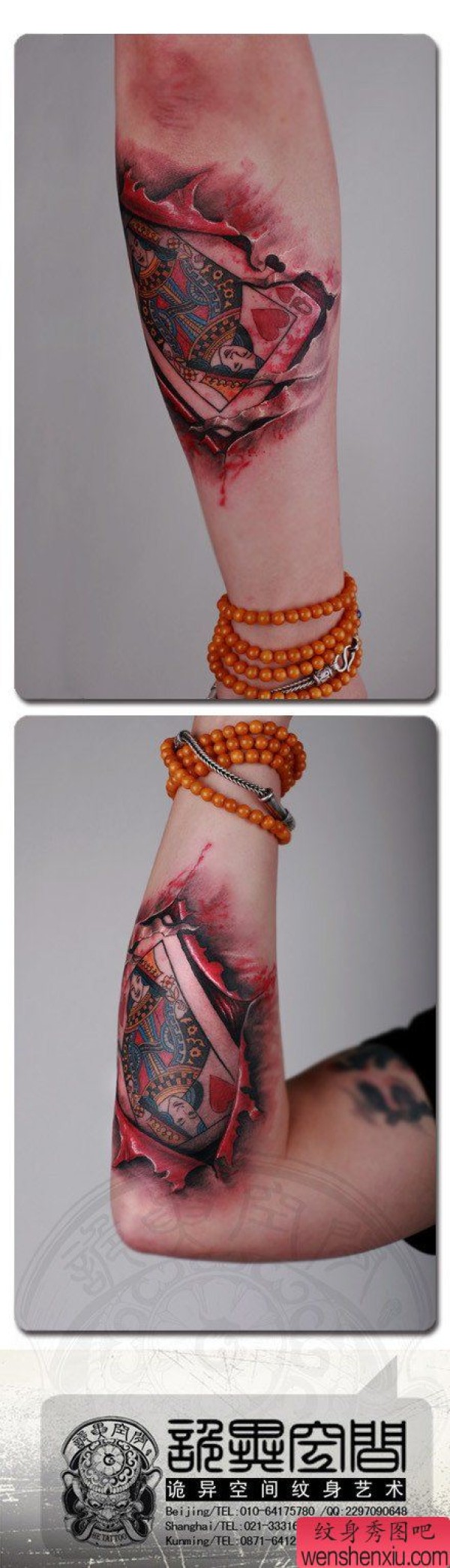 手臂时尚很酷的扑克牌与撕皮纹身图案