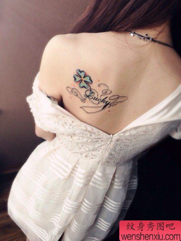女生后肩背时尚时尚的四叶草字母纹身图案