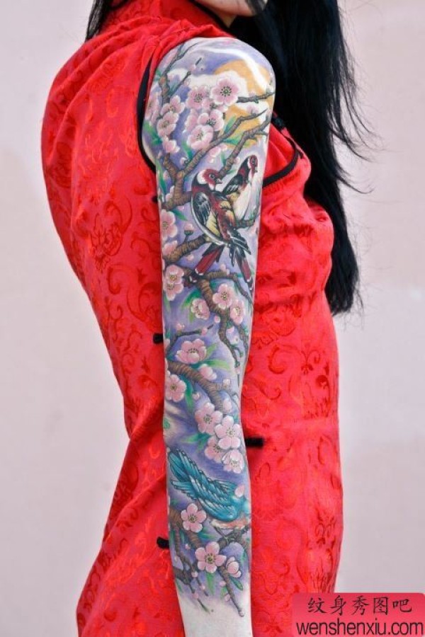 一张美女花臂喜鹊梅花纹身图案