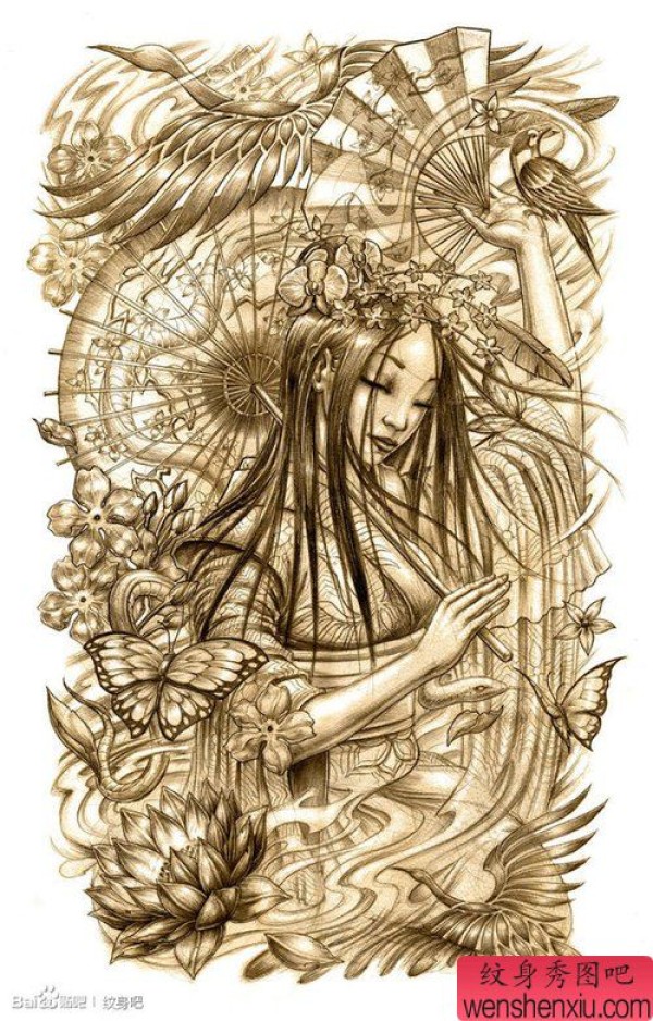 时尚漂亮的满背艺妓纹身图案