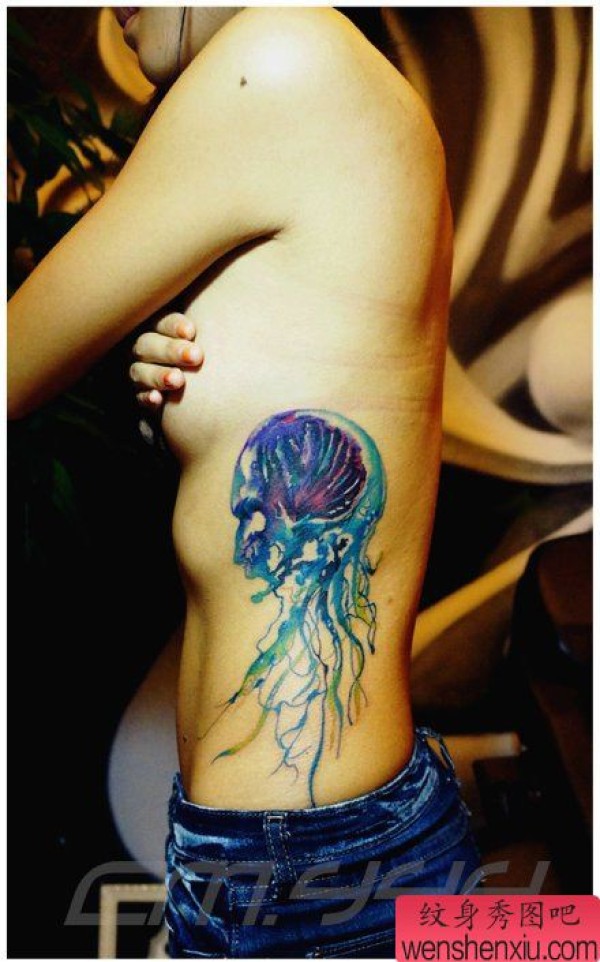 女生腰部漂亮时尚的水母纹身图案