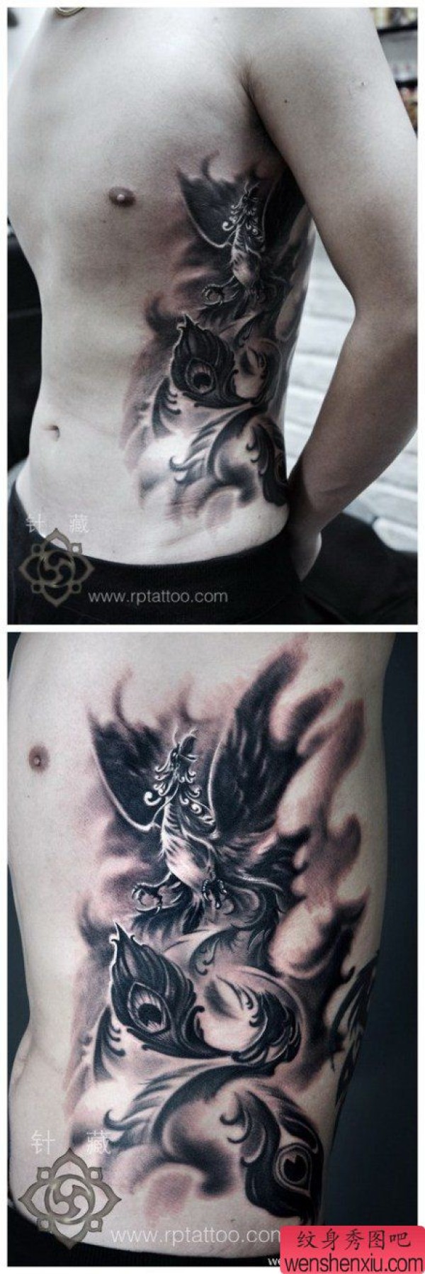 男生腰部时尚时尚的黑白凤凰纹身图案