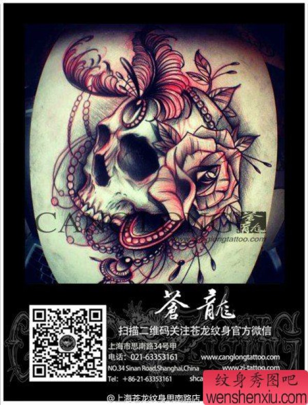 时尚时尚的一张骷髅与玫瑰纹身图案