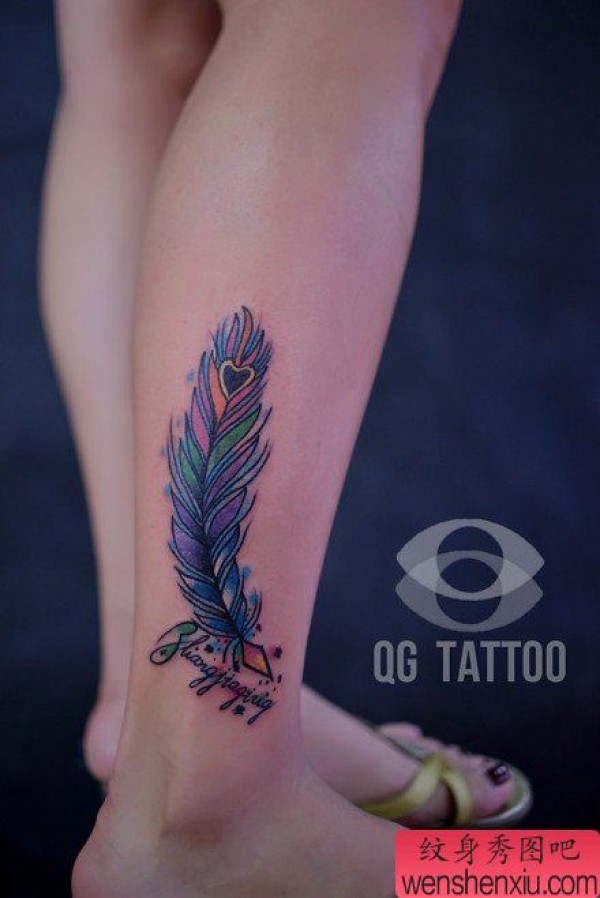 女生腿部唯美好看的彩色羽毛与字母纹身图案