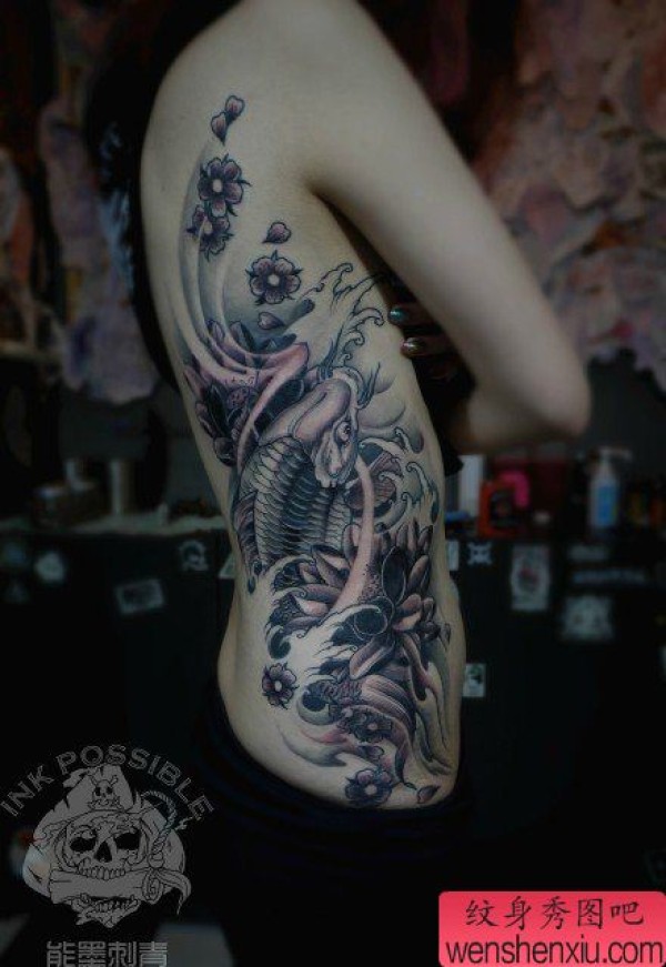 女生腰部唯美时尚的传统鲤鱼莲花纹身图案