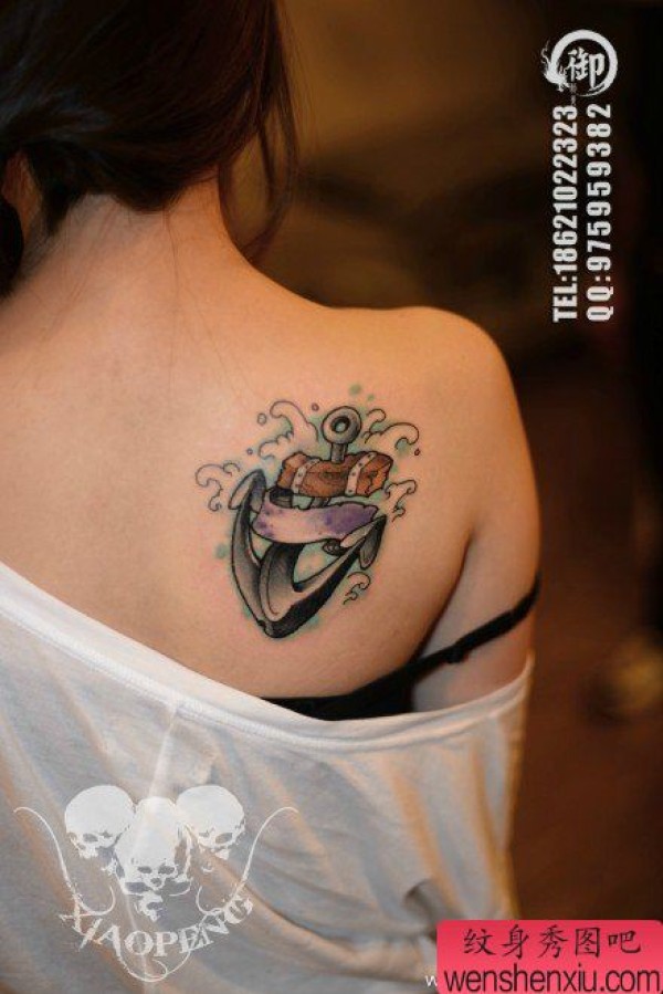 女生肩背好看精美的彩色船锚纹身图案