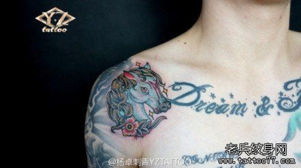 男生肩膀处时尚很帅的school风格的马纹身图案