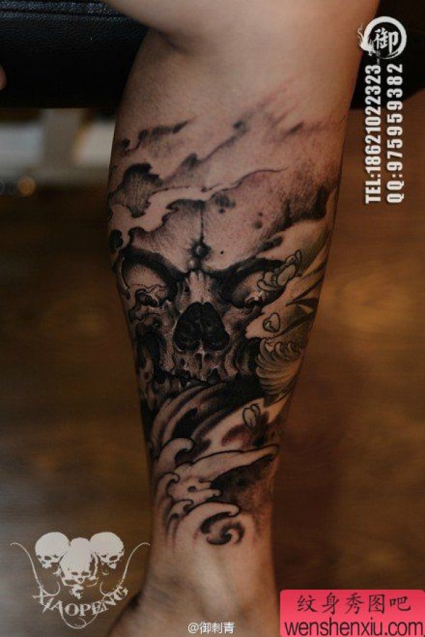 腿部时尚经典的一张黑白骷髅纹身图案