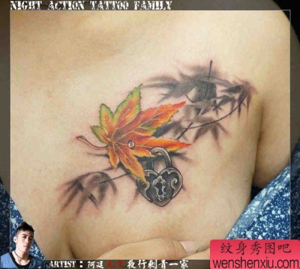美女胸前好看时尚的枫叶与爱心锁纹身图案