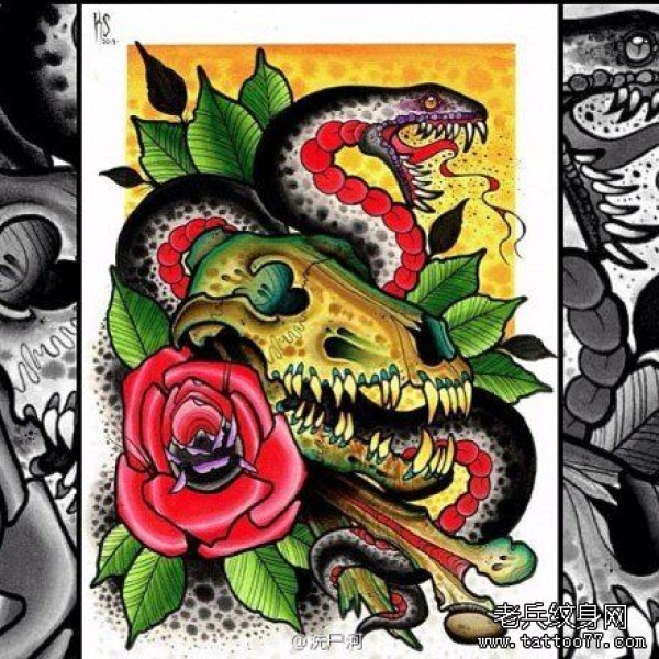 时尚很酷的一张蛇与恐龙骷髅纹身图案