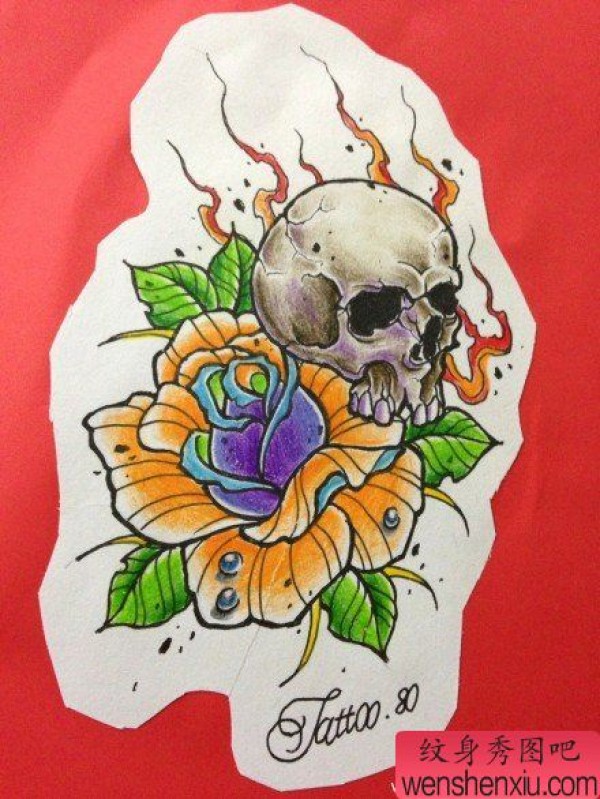 唯美小巧的骷髅与玫瑰纹身手稿
