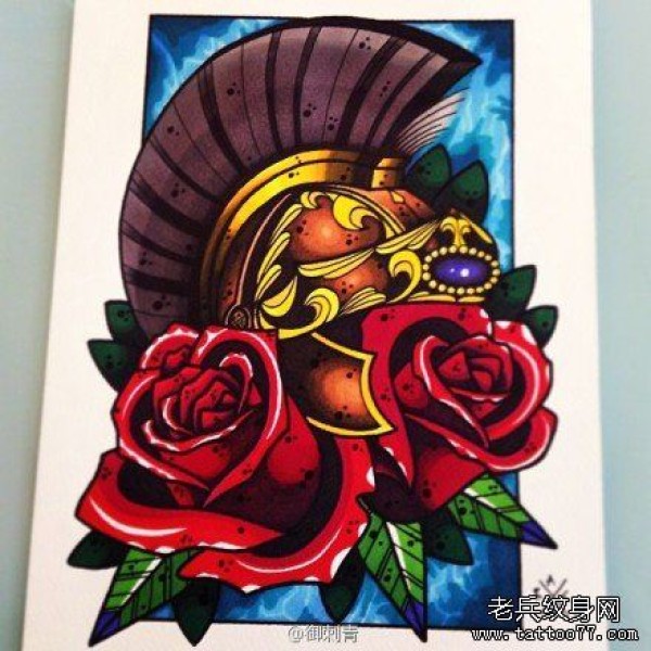 时尚经典的一张头盔玫瑰花纹身手稿