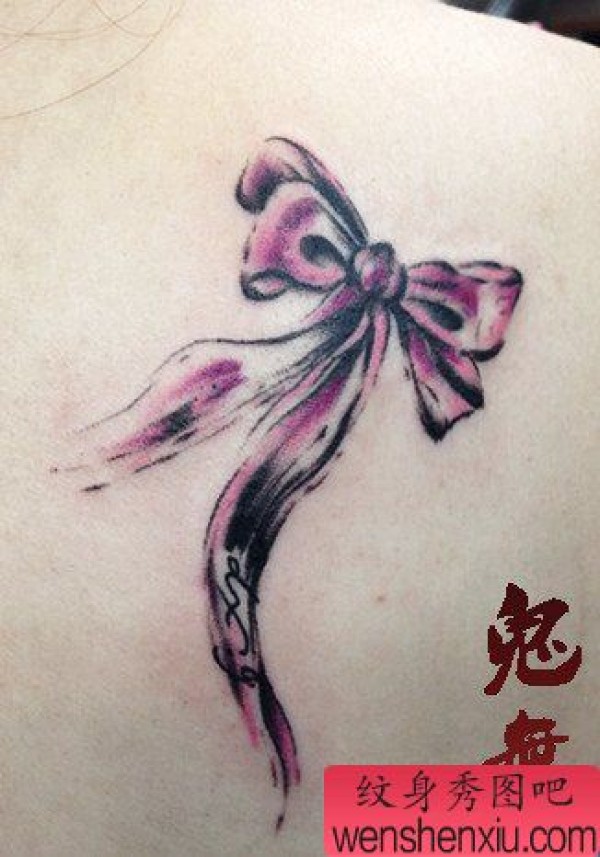 女生肩背唯美时尚的写意蝴蝶结纹身图案