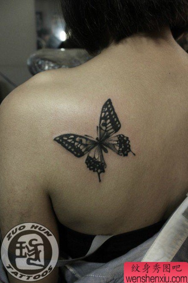 女生肩背唯美时尚的黑白蝴蝶纹身图案