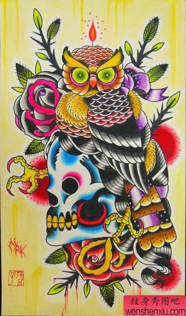 时尚时尚的一张猫头鹰与骷髅纹身手稿