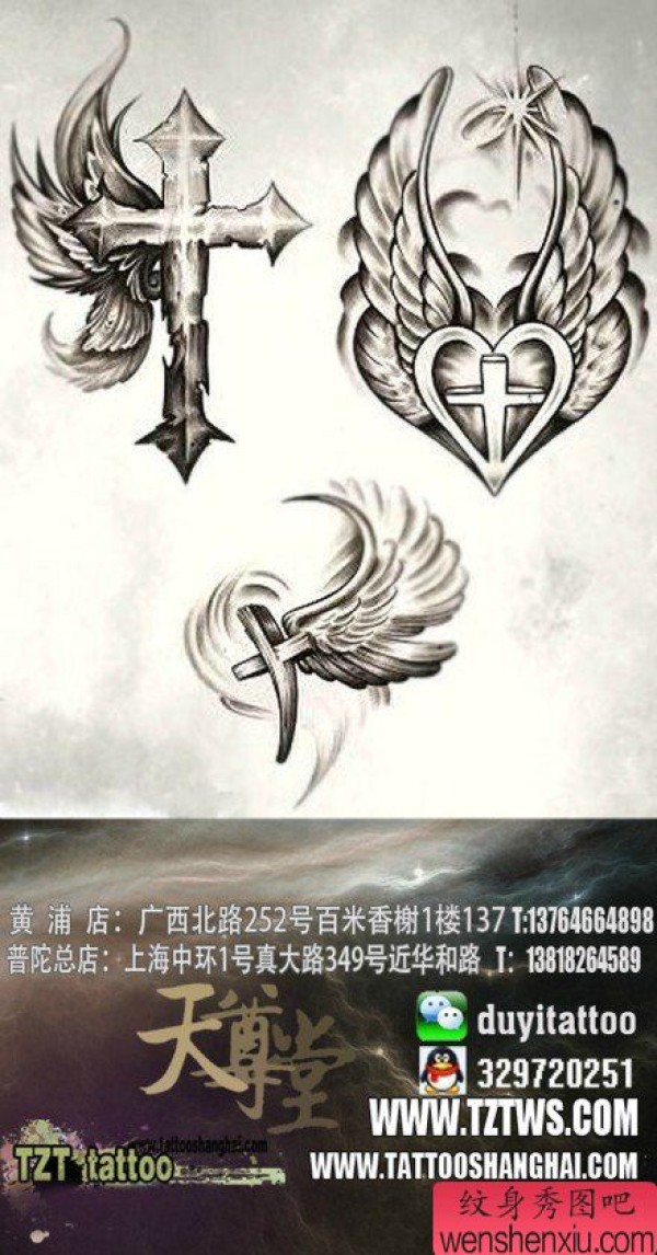一套唯美时尚的十字架翅膀纹身手稿