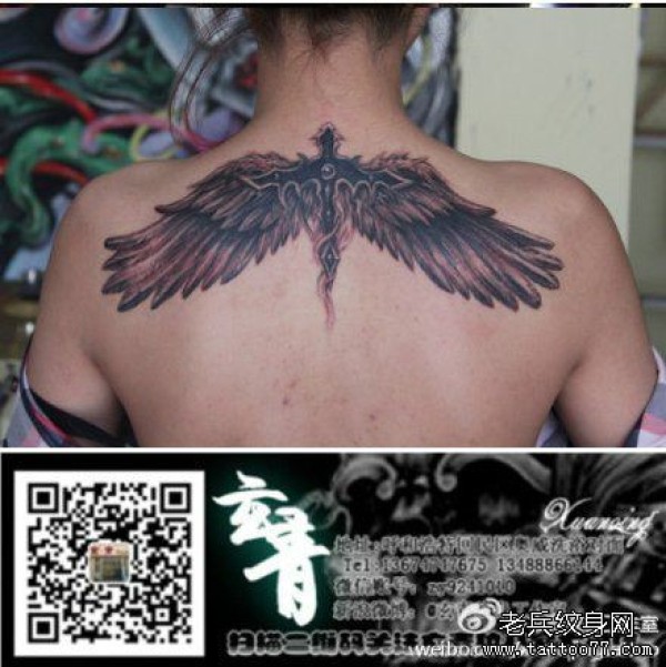 女生后背时尚经典的十字架翅膀纹身图案