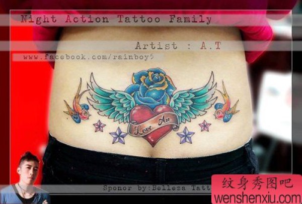 美女后腰时尚唯美的爱心翅膀玫瑰纹身图案