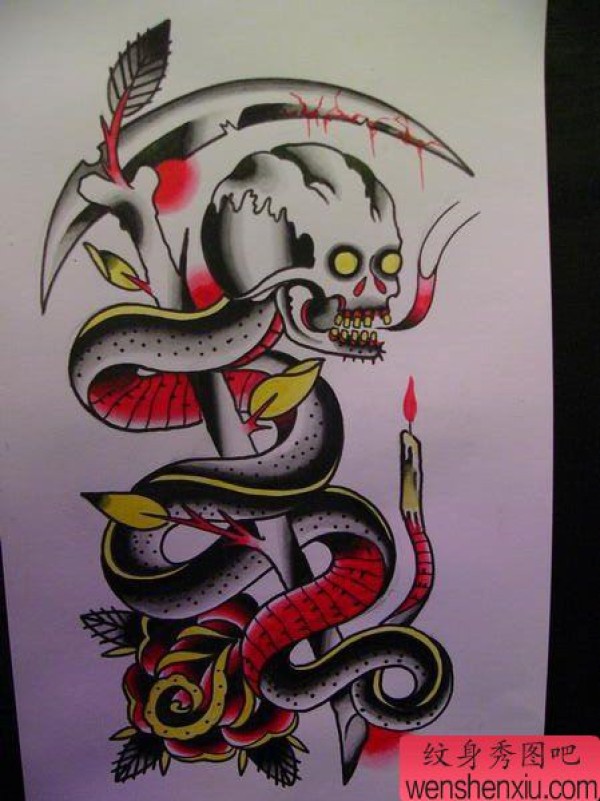 时尚很酷的一张蛇与死神镰刀纹身图案