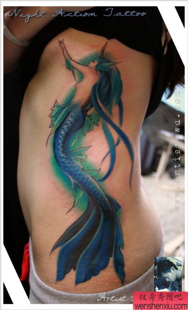 女生腰部时尚精美的美人鱼纹身图案