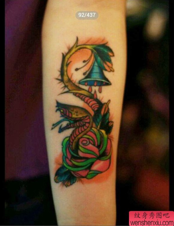 手臂时尚经典的蛇与玫瑰花纹身图案