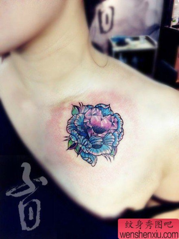 美女胸前精美的爱心钻石与玫瑰纹身图案