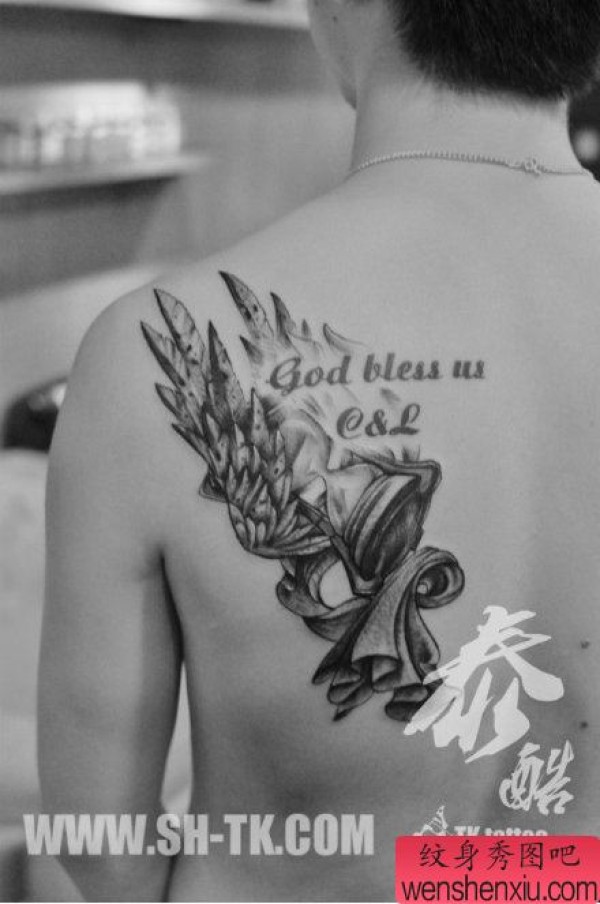 肩背时尚时尚的沙漏与翅膀纹身图案