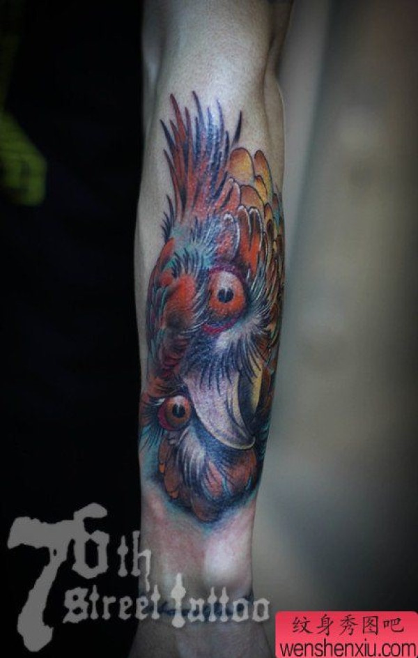 手臂时尚经典的一张彩色猫头鹰纹身图案