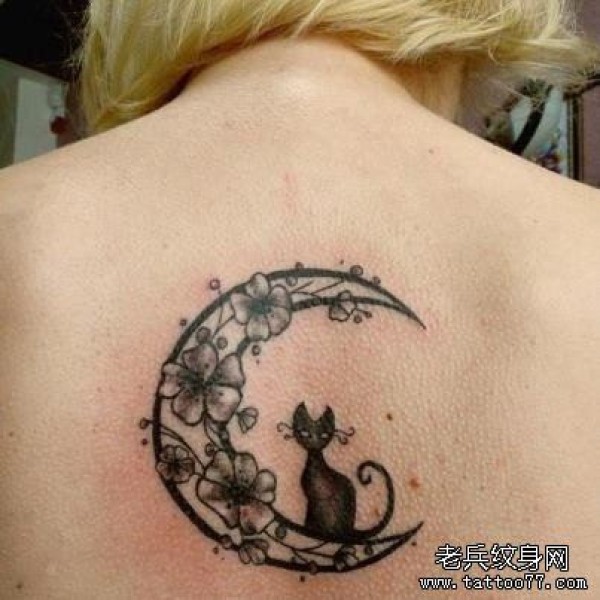 女生后背时尚经典的月亮与小猫咪纹身图案
