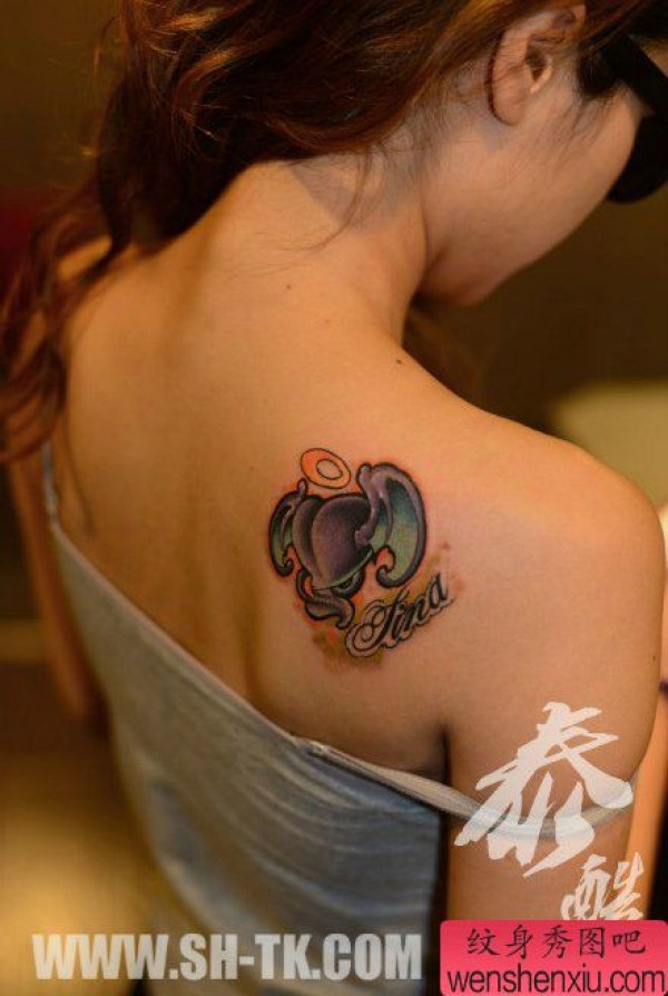 女生肩背唯美小巧的爱心翅膀纹身图案