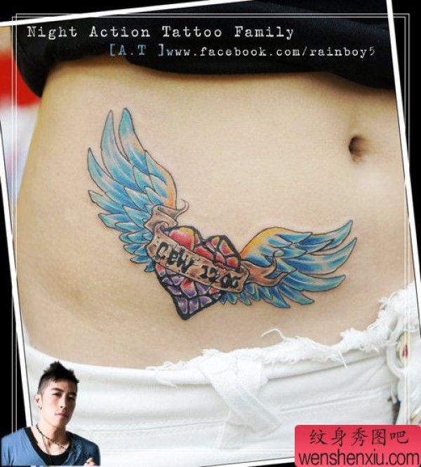 女生腹部唯美时尚的爱心翅膀纹身图案