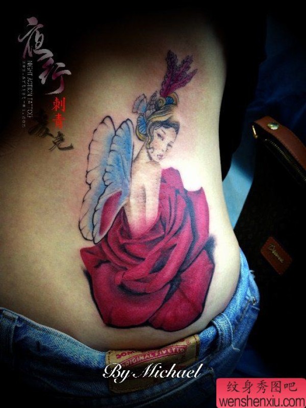 女生腰部漂亮时尚的玫瑰花与小精灵纹身图案