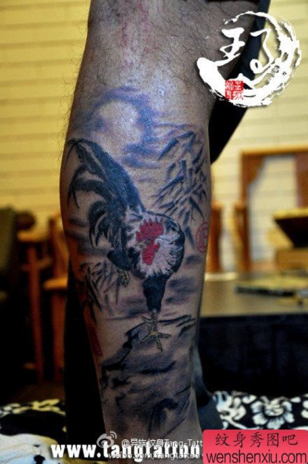 经典的腿部一张水墨公鸡纹身图案