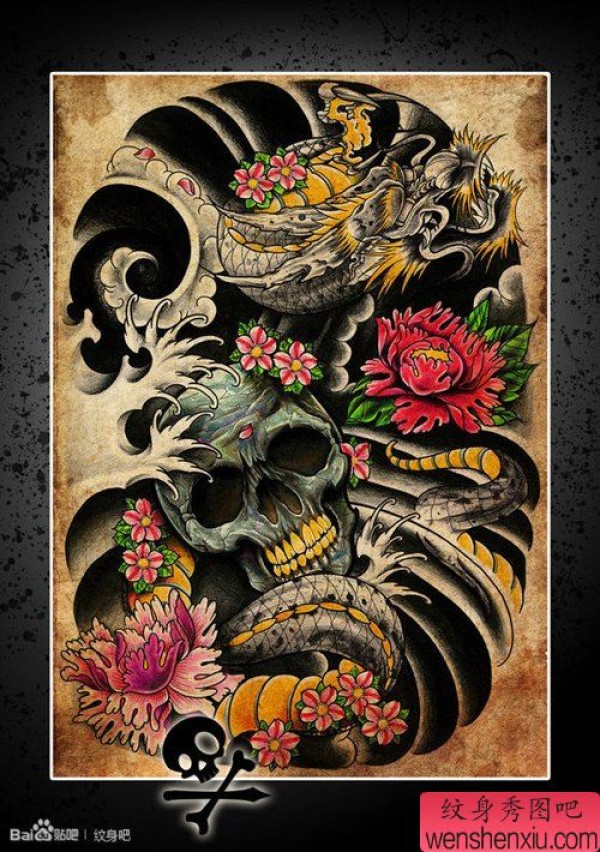 很酷超帅是一张龙与骷髅纹身手稿