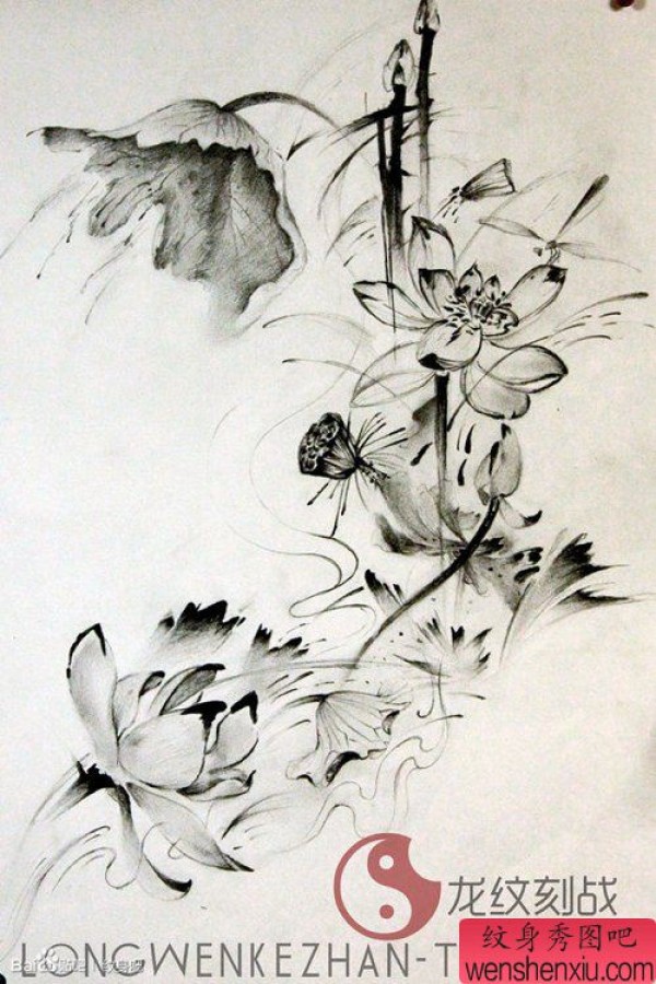 一套时尚精美的水墨莲花纹身手稿