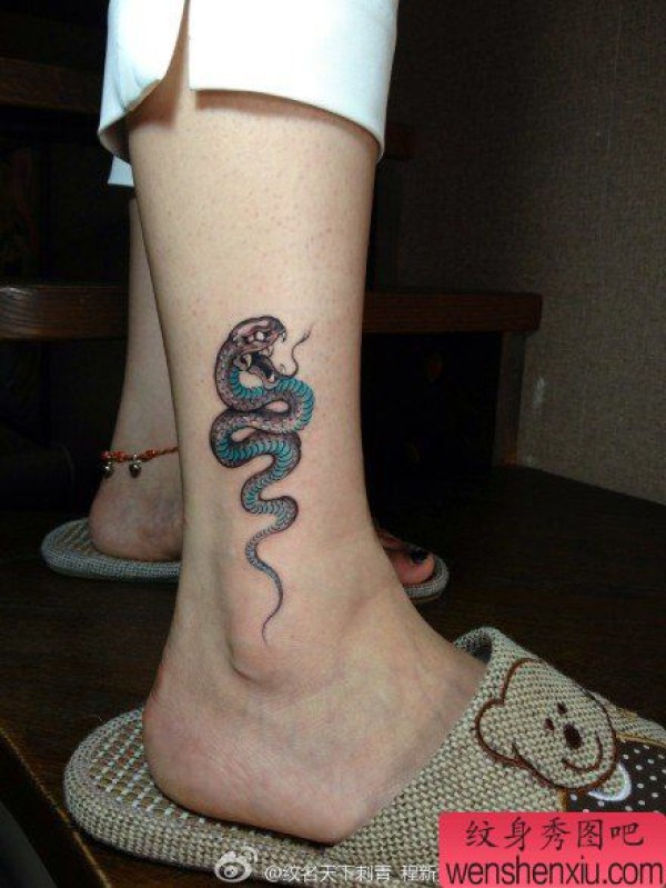 女生腿部时尚小巧的一张蛇纹身图案