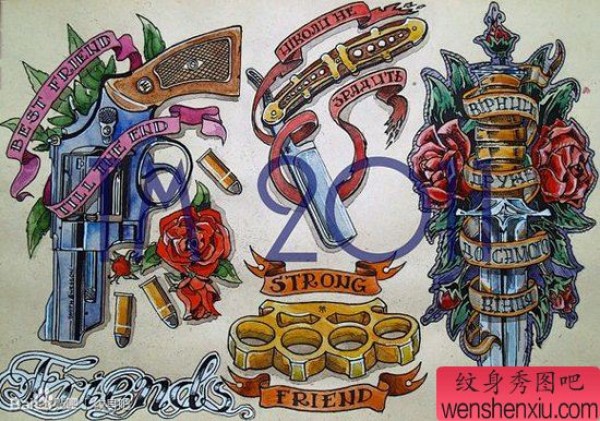 时尚经典的一套匕首手枪纹身手稿