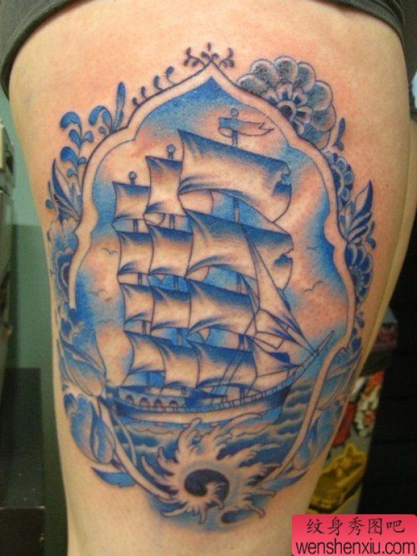 腿部时尚经典的帆船纹身图案